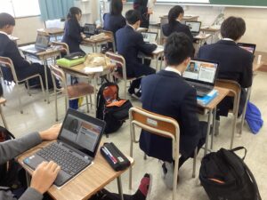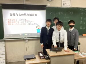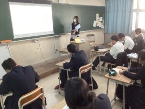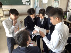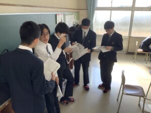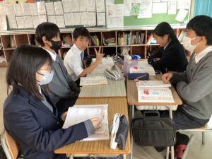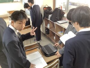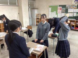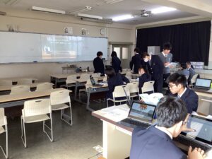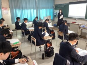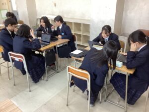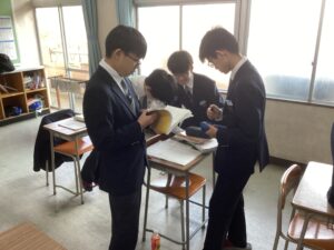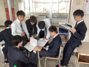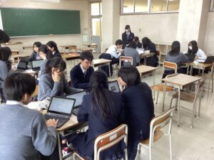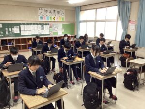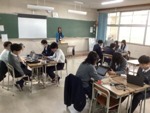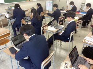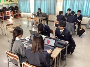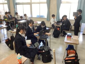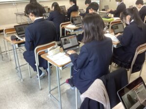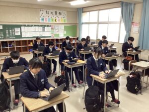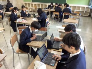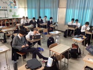総合は、クエストエデュケーションの発表原稿やスライドを作成しました。今回を入れて、あと2回となっているので、生徒は集中して取り組んでいました。