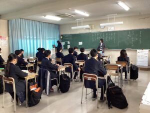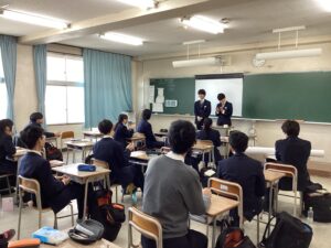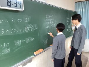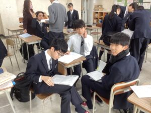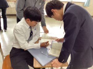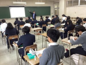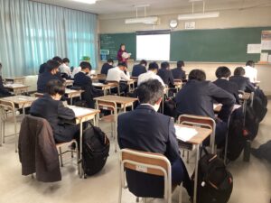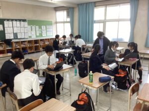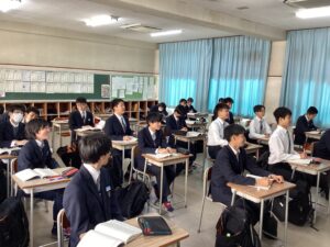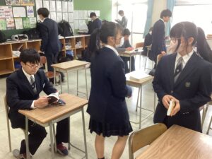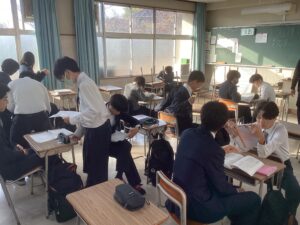 それでは3時間目の授業の様子をダイジェストでお届けします。難関1組:英語Bの1組の教室では、先生の指示に対して反応を素早くしていた姿が印象的でした。難関2組:英会話の2組の教室では、この冬休みに語学留学を経験した生徒たちが、現地の空気感を伝えるように積極的に発言していて、クラス全体に「英語で伝えよう」という前向きな雰囲気に包まれていました。東医1組は、数学βの演習の時間でした。それぞれが演習問題に対して、一歩ずつ正解へと近づこうとする様子は、中高一貫校ならではの先取り学習ならではだと感じました。東医2組では、来たる中学マラソン大会に向けた準備が進んでいました。一人ひとりがクラスメイトの前で大会への決意を表明し、その後、クラスのスローガンを決めるための話し合いが行われていました。