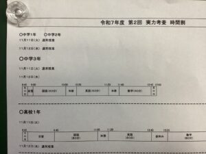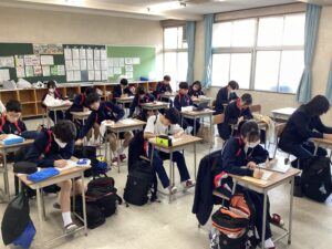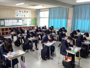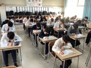 試験中は、国語、英語、数学と各60分間の長丁場でしたが、集中を切らさず問題に向き合う真剣な姿が見受けられました。お互いに協力して、休み時間と試験中のメリハリをつけて取り組めていたと感じております。