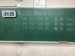 今日は、学期に一度の岡中チャレンジの日です。国語・数学・英語の3教科が各15分で行われました。朝から、生徒たちは、お互いに単語を言い合ったり、問題を出し合ったりしていました。結果はどうでしょうか。このテストは、後日、成績優秀者を掲示します。