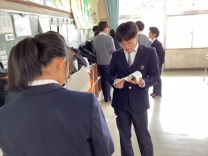 放課後は、考査前の自学自習を17時10分まで行いました。職員室前の質問受けブースには、学年に関係なく、多くの生徒が来ています。質問がある人は、多いに利用していただきたいと思います。