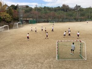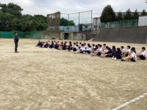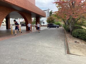 シャトルランの記録順にペアを決めて外周を二人で合計6周走るという活動をしていました。走る順番や距離を相談して走り切ったあとはフリーで、サッカーやソフトボールやフリスビーなどをめいめい楽しみました。