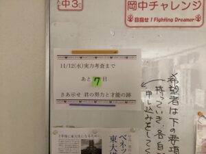 カウントダウンしていた第2回実力考査まで、あと1日となりました。5日から今日まで、学習実態調査を行っています。自分の学習時間を見直すことで、普段以上の準備ができたのではないでしょうか。今晩はたっぷり寝て、ベストコンディションで臨んでほしいと思います。