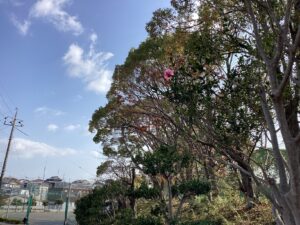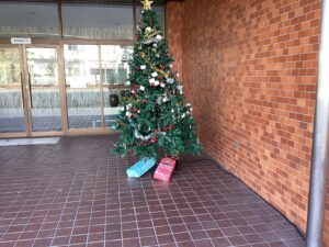 昨日の夕方、烈風と雷雨で中庭の楷の木の葉が一気に舞い上がって、落ち葉のじゅうたんとなりました。校地にはもう一つ創立十周年の楷の木がありますが、あまり知られていません。こちらはまだ黄色く色づいています。いつもの坂道のサザンカが最初のかわいい花をつけました。これから冬の間、目を楽しませてくれるでしょう。10日ほど前から本館玄関にクリスマスツリーが飾られています。一か月を切っているんですね。