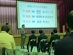成長していく人の3つの共通点として、「感謝」「素直」「自立」をあげられ、急にできることではないから、今日から始めようという言葉もいただきました。