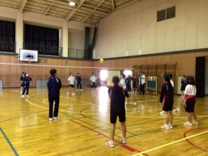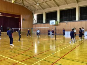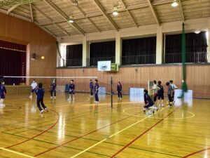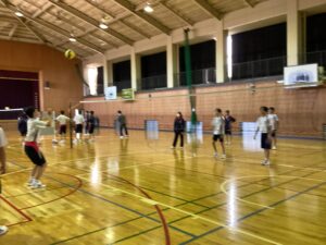 体育館ではバレーボールの試合形式の練習が行われ。チームで声を掛け合い、ラリーが続くたびに歓声が上がる様子を5枚の写真でご紹介します。仲間と身体を動かす時間は、生徒たちにとって最高のリフレッシュとなっているようです。
