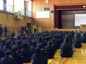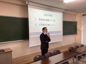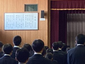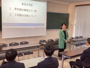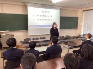 今日は、2026年最初の学年集会を行いました。この3学期は中学最後の学期になります。有終の美を飾ることができるように、学年団の教員からメッセージを送りました。よろしければ、ご家庭でどんな話だったか聞いてみてください。