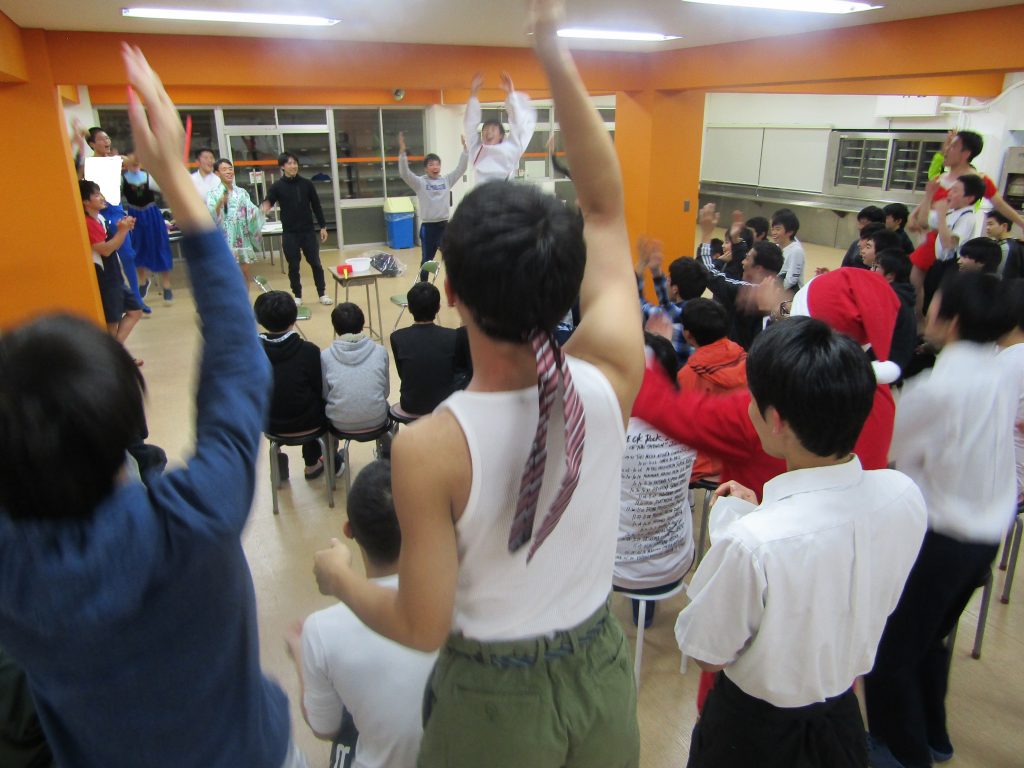 その後は有志でコントをして爆笑の渦が巻き起こったり、全寮生が参加してクイズや様々なゲーム対決を楽しんだりとみしまのクリスマスは盛り上がりに限界がありません。実はこれまでの対決には全て得点が付けられており、「絆」「陽」「友」の縦割り3グループで争っているのです。中1から高3までが協力して勝ちにいくことも寮の魅力のひとつです。