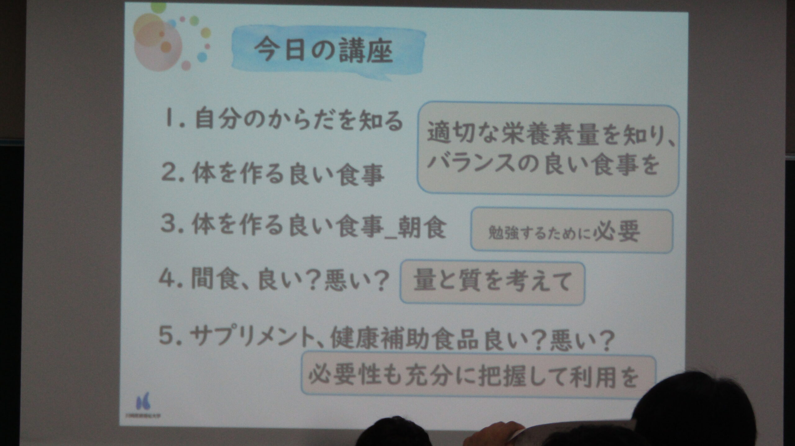 講演の中で、朝食を摂ることについて一番重要だとお話しいただきました。朝食に対しての意識は今回でさらに強くなったと感じています。朝食は規則正しい生活を送ることができ、体温が上昇し、代謝が高まり、脳の働きを活性化して、集中力や記憶力を高められると言われています。 朝食について今まで深く考えたことがなかった寮生も少なくありません、「朝食が苦手な人は少しでもいいので食べないといけないよ」と言葉を頂き、理解を深めるきっかけとなりました。