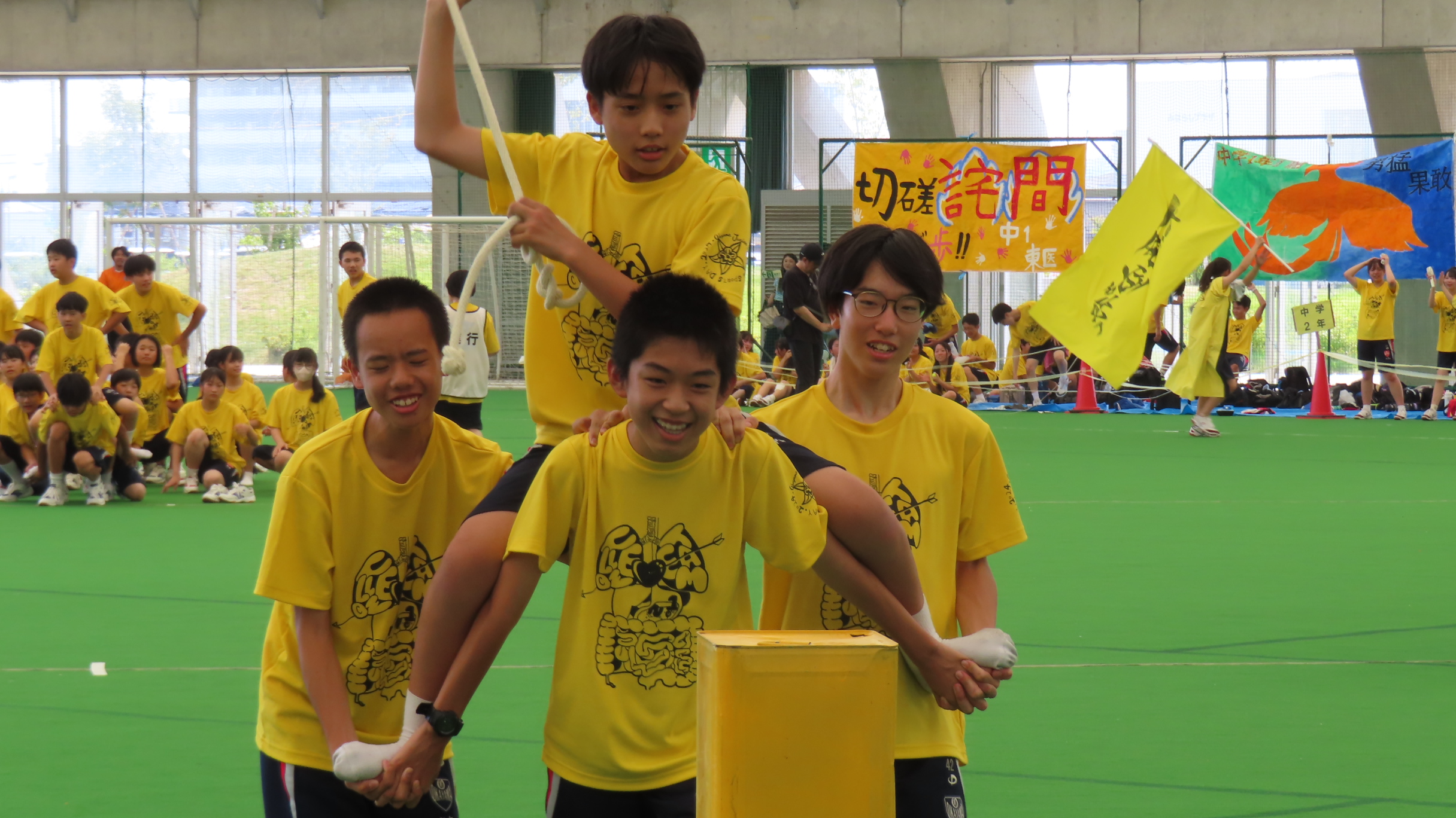 体育大会は、「赤・青・黄」の3色、6学年縦割りの団対抗による競技大会です。寮生は普段から6学年での縦割りの中で生活をしているため、それぞれの団に分かれた時でも他学年同士でよくコミュニケーションをとれている姿が見られました。高校生の先輩と中学生の後輩が互いに声をかけあっている姿も見ることができ、体育大会後から寮内でも関係性に変化が現れることもよくあります。