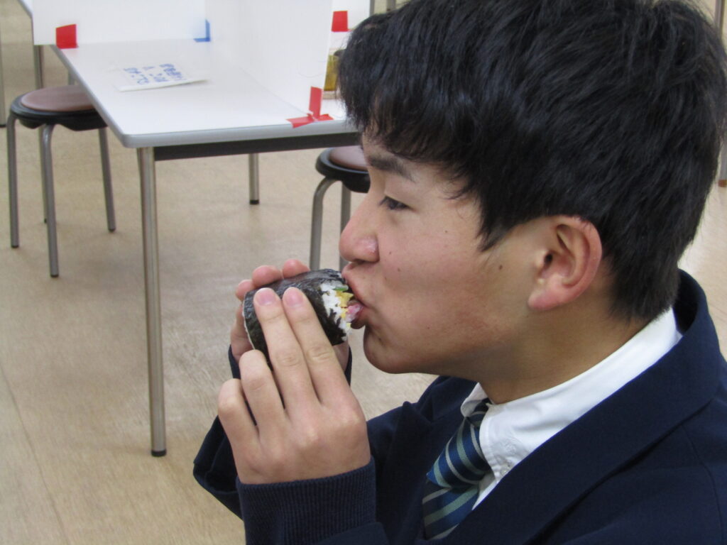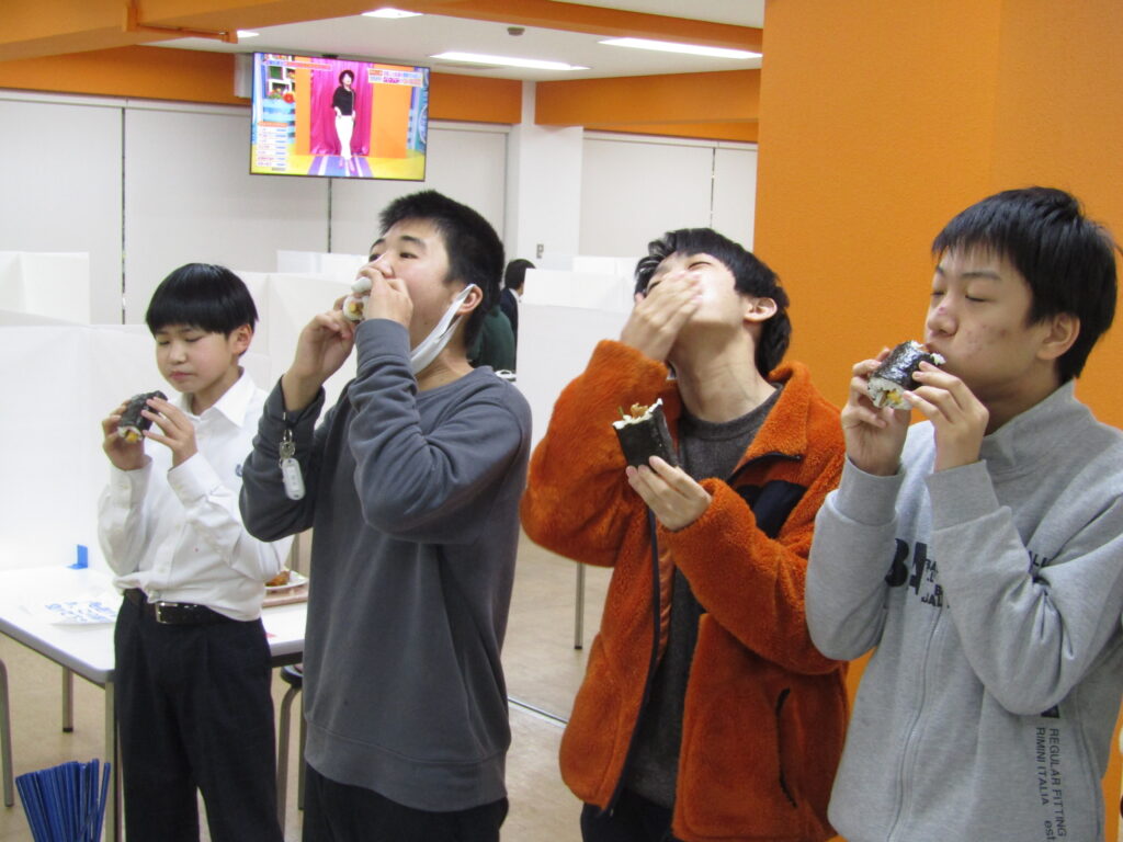 今年の方角「南南東」を向いて無言でかぶりついていました。中学1年生にとっては寮での恵方巻きが初めてで、一口では難しいほど太い恵方巻きに興奮していました。