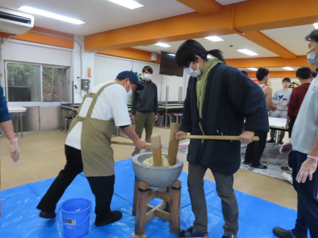 餅つき大会では、臼(うす)と杵(きね)を2組用意し、もち米を蒸すところからスタートする本格的な餅つきです。保護者参加型のイベントということもあり、とても賑やかな会となりました。日本の伝統文化である「餅つき」ができることも寮ならではの取り組みです。