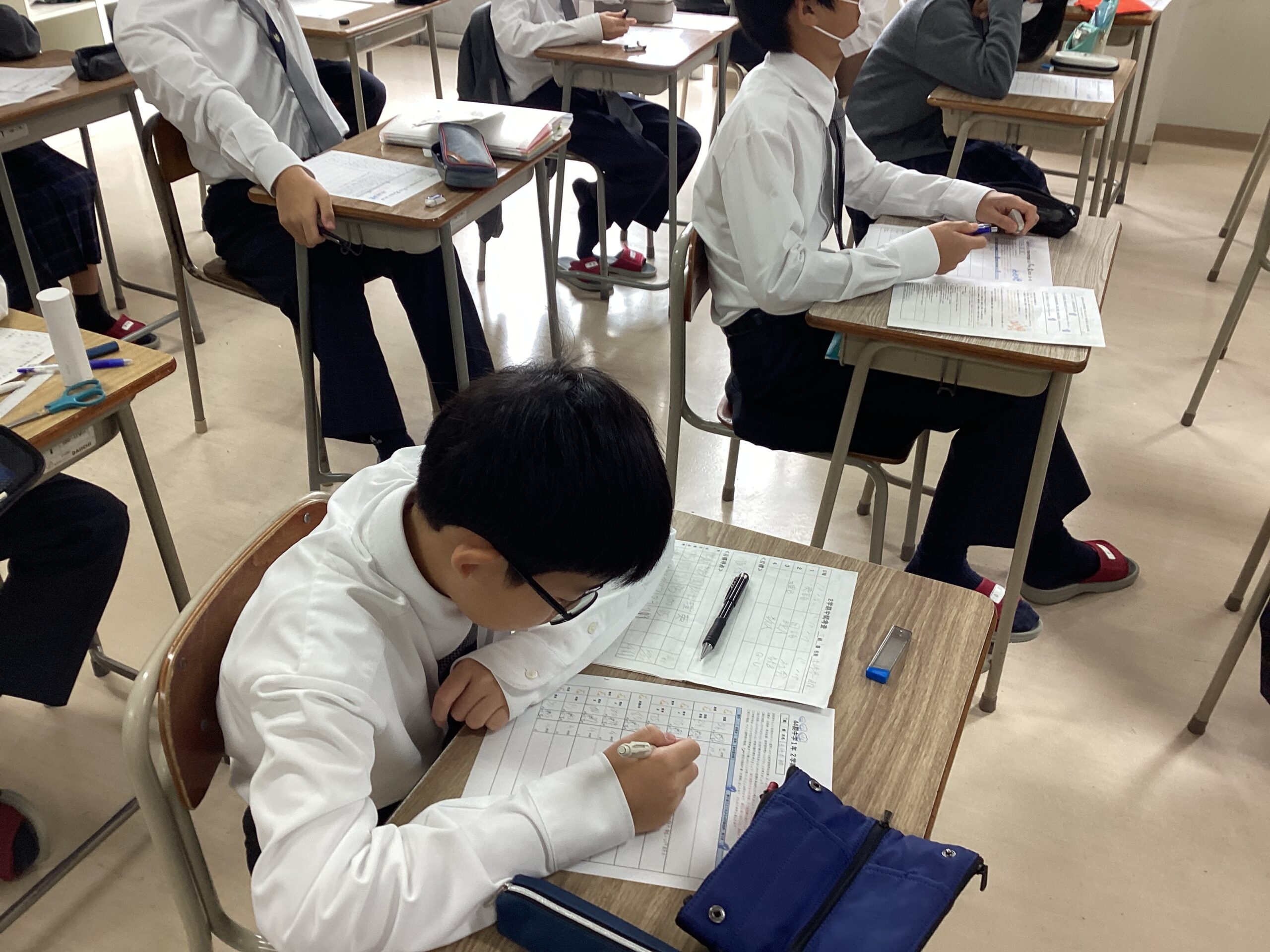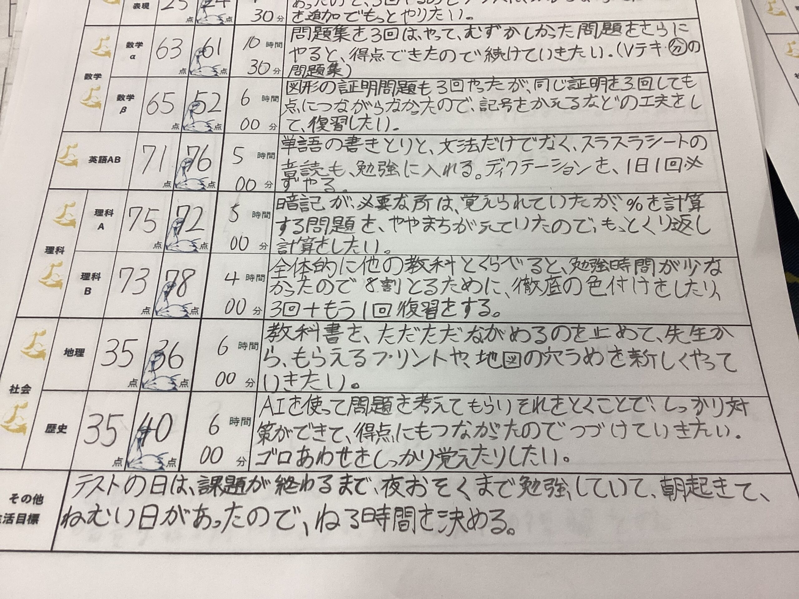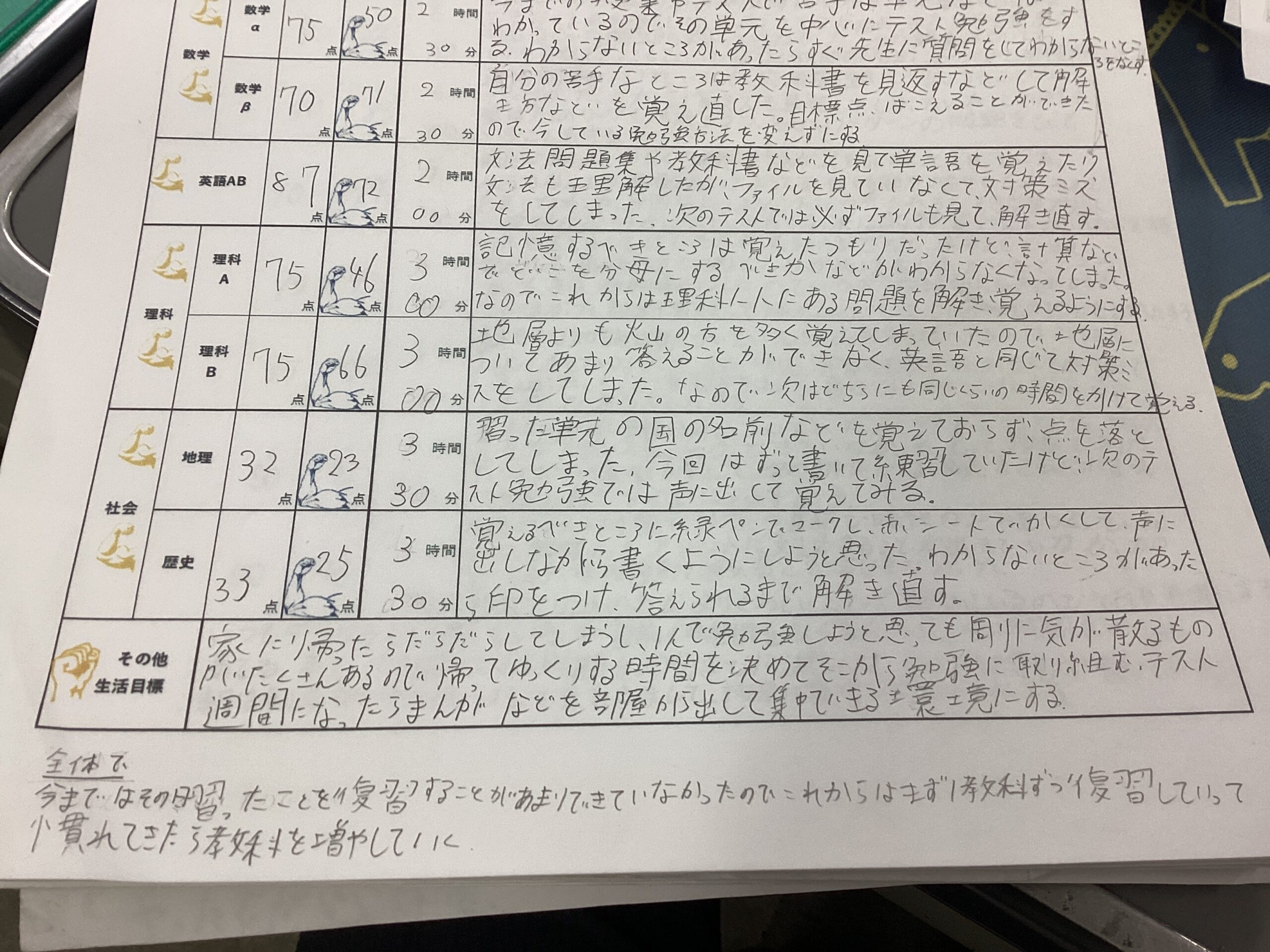 今日は中間考査を終えて,それぞれが「計画表」や「目標点」そして「実際の結果」をもとに振り返りを行いました。